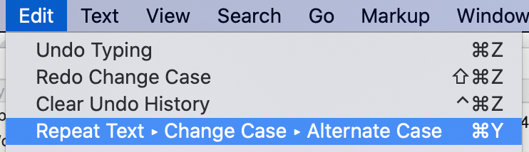 Here’s the Edit menu after choosing the new “Alternate Case” command: